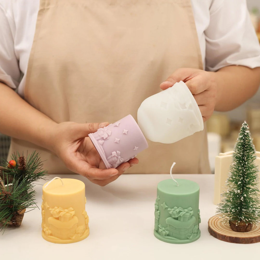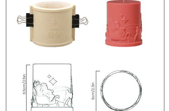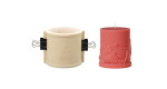 Praktická silikonová forma na svíčky se z boku naříznutým tělem, plastovým obalem a sponou – pro stabilní lití a snadné vyjmutí svíčky bez poškození detailů. Vyrobená z platinum food-grade silikonu, vhodná pro včelí, sójový i parafínový vosk.