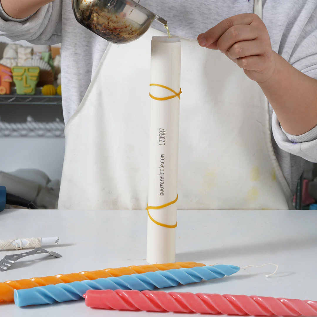 Praktická silikónová forma na sviečky so zboku narezaným telom, plastovým obalom a gumičkami na pevné stiahnutie – pre stabilné liatie a ľahké vyberanie sviečky bez poškodenia detailov. Vyrobená z platinum food-grade silikónu, vhodná na včelí, sójový aj parafínový vosk.