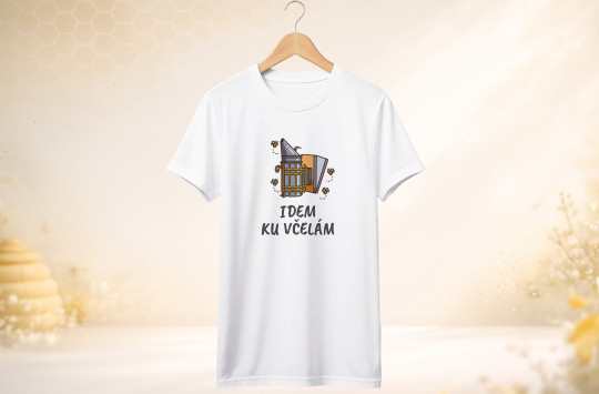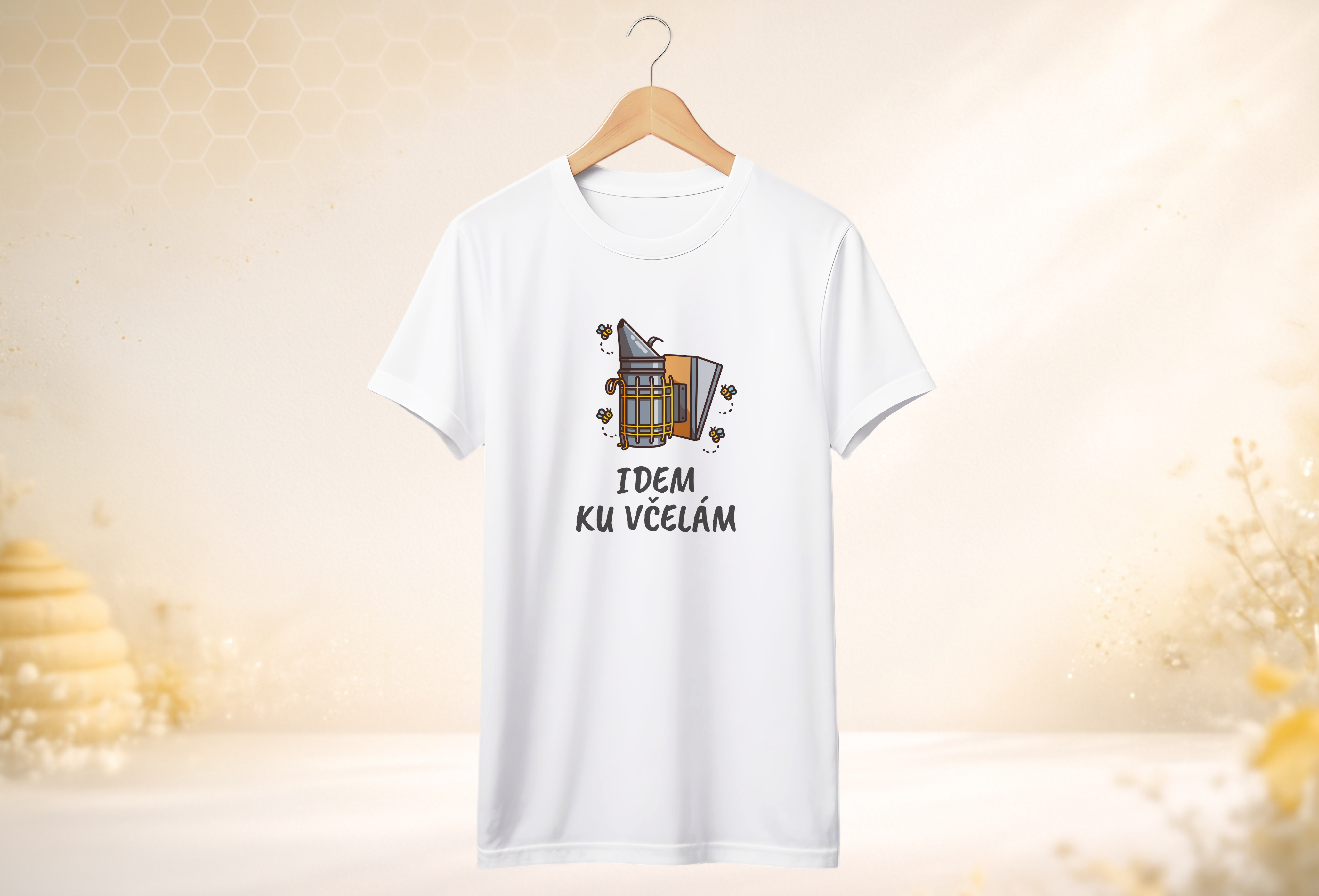 Biele tričko s včelárskou tématikou zo 100 % bavlny potlačené na hrudi.