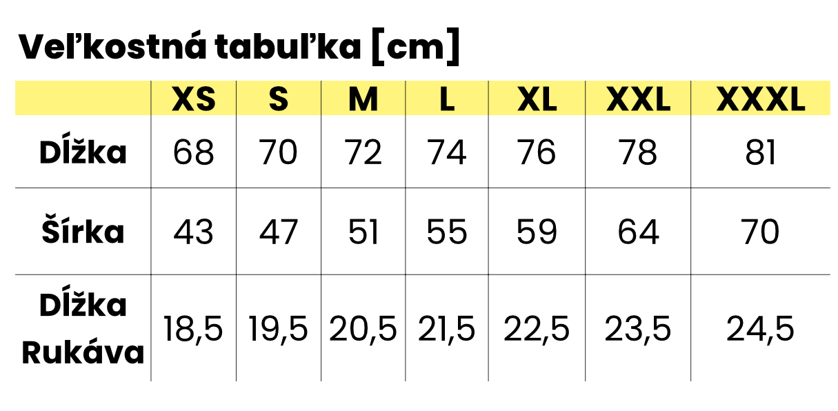 | Dĺžka rukáva | 18,5 | 19,5 | 20,5 | 21,5 | 22,5 | 23,5 | 24,5 |